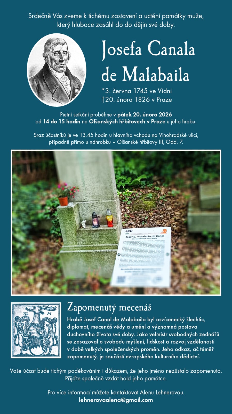Spolek Malostranský hřbitov srdečně zve na pietní akt u příležitosti výročí 200 let od úmrtí hraběte Josefa Canala de Malabaila (1745 - 1826), osvíceného šlechtice, diplomata a mecenáše. Setkání se uskuteční v pátek 20. února 2026 od 14 hodin u jeho náhrobku, Olšanské hřbitovy III, odd. 7 (případně sraz ve 13:45 hodin u hlavní brány na Vinohradské ulici). Další informace naleznete v přiložené pozvánce. Akce je pořádána s laskavým svolením organizace Hřbitovy a pohřební služby hl. m. Prahy.