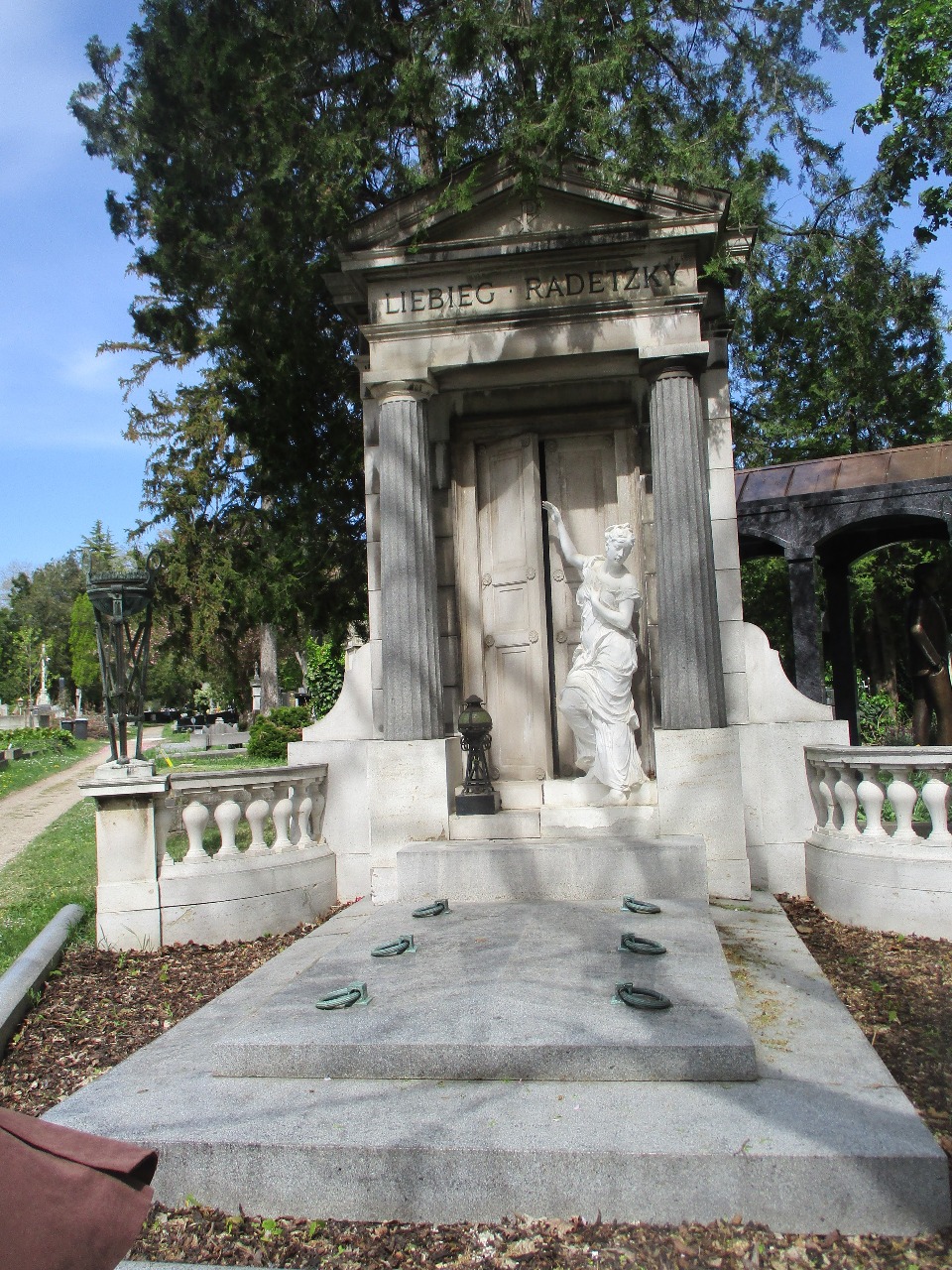 Paní Kiradi s námi předtím běhala celé dopoledne po Ústředním hřbitově, aby pomohla najít námi hledané hroby rodiny Radeckých – hrob Theodora, maršálova syna, a jeho manželky je bohužel určen ke zrušení (obr. 4), ale hrobka Radeckých z Radče, kde je pohřbena i Gabriela Tereza von Liebig ze známé liberecké podnikatelské rodiny, je už pěkně opravena. Její socha je dílem slavného rakouského sochaře Viktora Oskara Tilgnera (obr. 5). Dalším hledaným objektem byl náhrobek Františka Josefa knížete z Dietrichsteinu, dílo pražského německého sochaře Emanuela Maxe z 50. let 19. století. (obr. 6, obr. 7). Náhrobek byl v roce 1906 přenesen ze hřbitova sv. Markuse na Ústřední hřbitov. Paní Kiradi projevila zájem o náš Malostranský hřbitov s tím, že se chystá do Prahy. Výměna zkušeností při péči o historické hroby by mohla být docela zajímavá. Naše rakouská přítelkyně projevila zájem také o projekt Adopce hrobů, propojíme ji s koordinátorkou projektu Barborou Duchkovou.