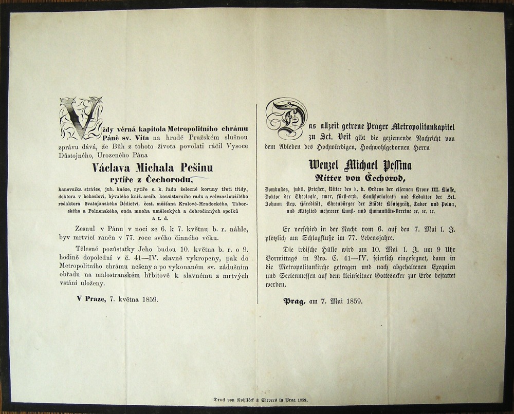 obr. 8: Úmrtní oznámení Pešiny z Čechorodu