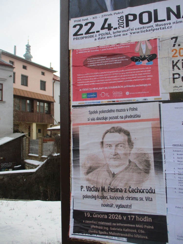 Co ale kanovníka Pešinu dovedlo až k myšlence na dostavbu pražské katedrály, a čím se zabýval až do svého odchodu do Prahy, kde mohl konečně začít uskutečňovat svůj velký sen? Tuto otázku jsem si dlouho kladla a snažila jsem se dohledat příslušná data. Proto mne velmi potěšilo pozvání z Polné, abych jim udělala přednášku (již v pořadí třetí) o jejich slavném, i když dnes už polozapomenutém čestnému spoluobčanovi. Doufala jsem také, že zde získám nějaké další informace, týkající se počátků Pešinovy činnosti (Polná byla jeho prvním působištěm). Přednáška, která se konala dne 19. února 2026 v informačním centru na radnici, měla ukázat pestrost zájmů této nanejvýš úctyhodné osobnosti. Nešlo zde pouze o jeho obecně známou zásluhu o dostavbu pražské katedrály, ale také o jeho dlouholetou ředitelskou činnost v Dědictví sv. Jana Nepomuckého, jeho redaktorskou činnost v Časopisu pro katolické duchovenstvo, jeho zásluhy o vznik Muzejníka (Časopisu Národního muzea), který je nejstarším dosud vycházejícím vědeckým časopisem. Výzvu, vedoucí k jeho založení, Pešina uveřejnil již v roce 1821 v časopise Čechoslaw. Časopis pak vznikl v roce 1826, a redaktorem jeho obou jazykových verzí se stal František Palacký (letos si připomeneme 150. výročí jeho úmrtí). Pešina byl také horlivým podporovatelem Matice české, a to od jejího vzniku v roce 1831 – v seznamu členů byl veden pod číslem 13). Přednáška se dotkla také Pešinovy účasti na poslední pražské korunovaci. On se jí nejen prokazatelně zúčastnil (je vidět na jednom z jejích zobrazení), ale ji také podrobně popsal. Jeho popis: „Zpráwy o Korunowánj wéwodů a králů českých: s cjrkewnjm obřadem Korunowánj Gejich Cjsařských Majestát, Ferdinanda I. za krále Českého, a Marie Anny Karoliny Piy za králownu Českau“ měl totiž německojazyčného konkurenta, Gustava Thormunda Legis-Glückseliga (1806 Praha – 1867 Praha), kterému stavovský sněm udělil funkci korunovačního historiografa. Legis-Glückselig, který se považoval za konkurenta Františka Palackého, byl zastáncem tzv. zemského patriotismu. Jako paradox zní, že právě on napsal životopis Václava Hanky, pravděpodobného autora Rukopisů. I oni byli přes jazykovou rozdílnost blízkými přáteli. Legis-Glückselig byl rovněž pohřben ve staré části MH, ale jeho náhrobek se nedochoval.