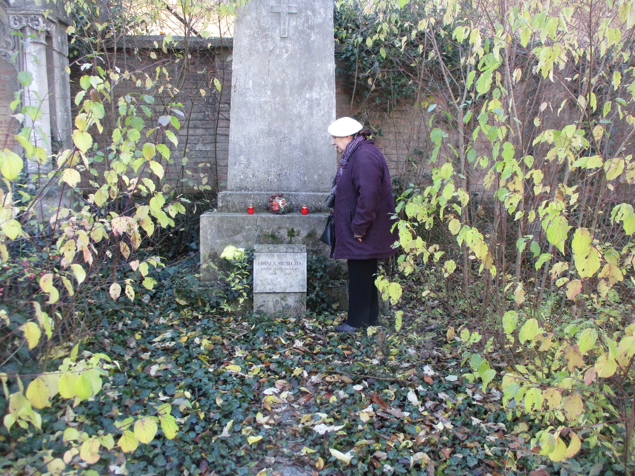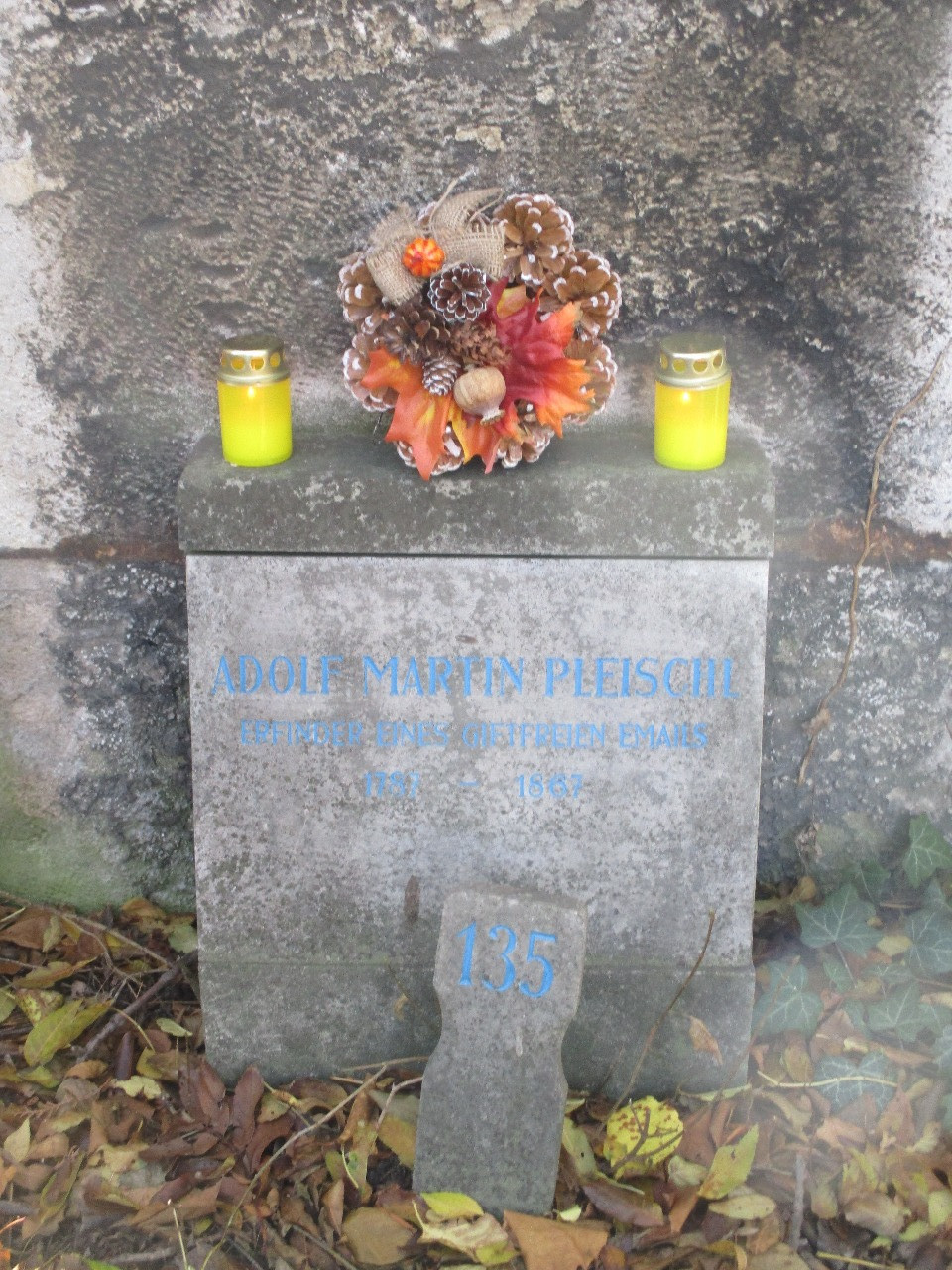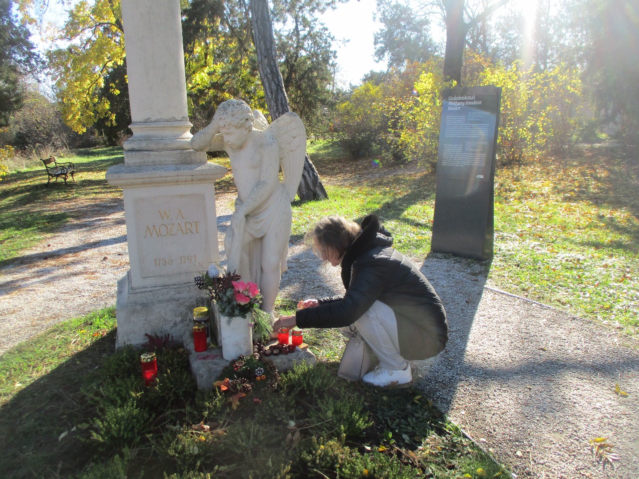 Kromě Mozartova hrobu, kam jsem položily věnec a zapálily svíčky, (obr. 6, obr. 7) jsme navštívily za stejným účelem hrob Františka Xavera Němečka (1766-1849), profesora pražské i vídeňské univerzity a autora prvního samostatného Mozartova životopisu (ten vyšel již v roce 1798, dlouho před uznávaným životopisem Georga N. von Nissena, druhého manžela Constanze Mozartové). Prof. Němečka známe také jako pěstouna Mozartových synů Karla Thomase a Františka Xavera z doby jejich pobytu v Praze. (obr. 8) Naším dalším cílem byl kenotaf prof. Adama Martina Pleischla (1787-1867), profesora pražské a vídeňské univerzity a vynálezce bezolovnatého emailu, který otevřel karlovarské minerální vodě vítěznou cestu do světa. (obr.9)